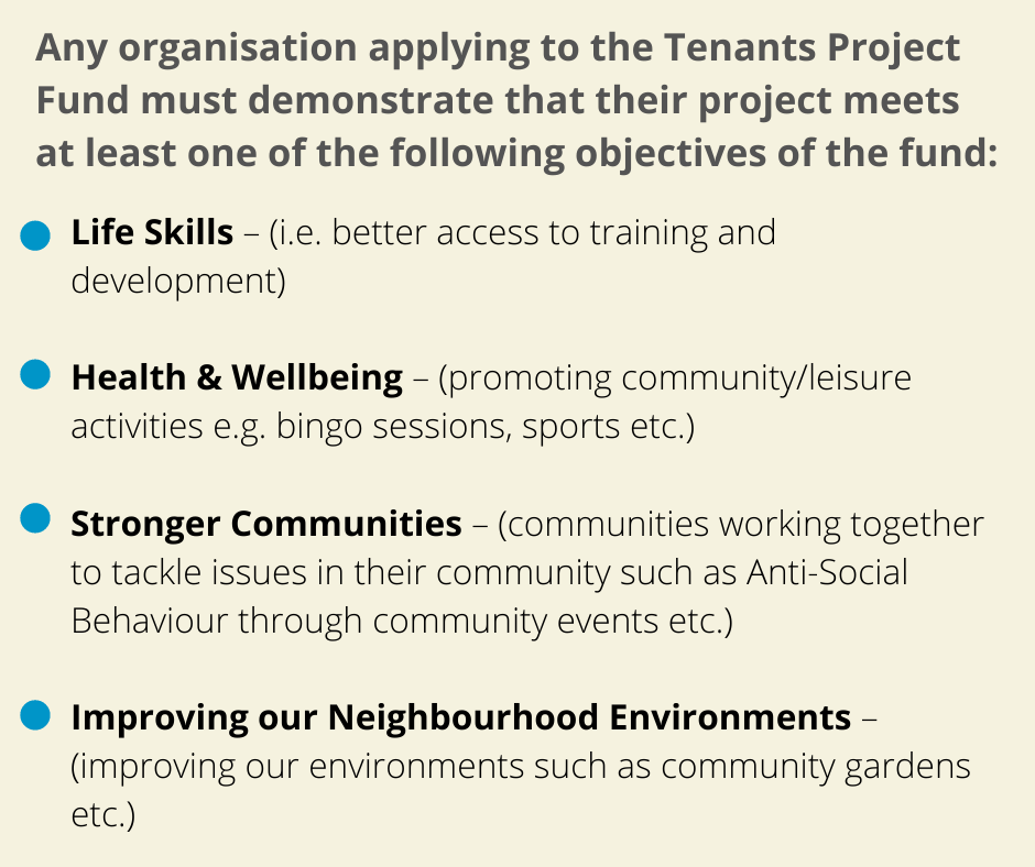 Any organisation applying to the Tenant's Project Fund must demonstrate that their project meets at least one of the following objectives of the fund: